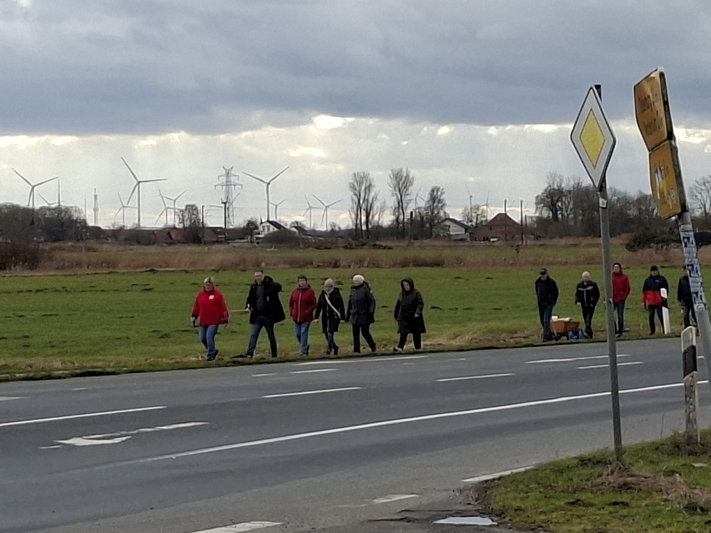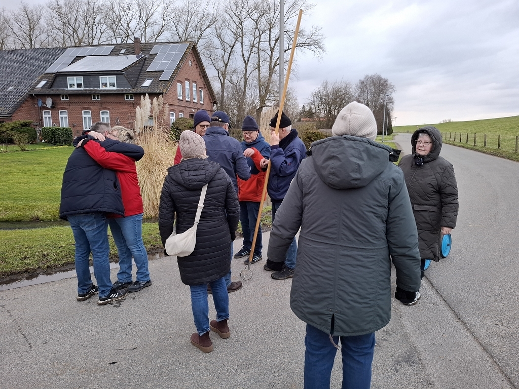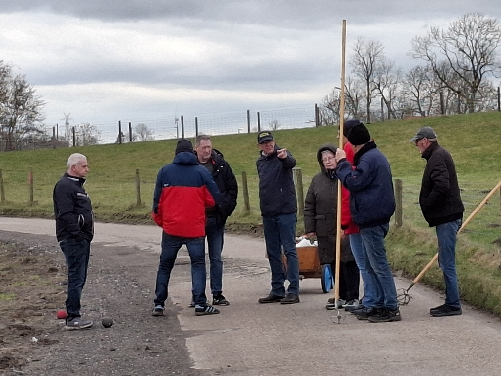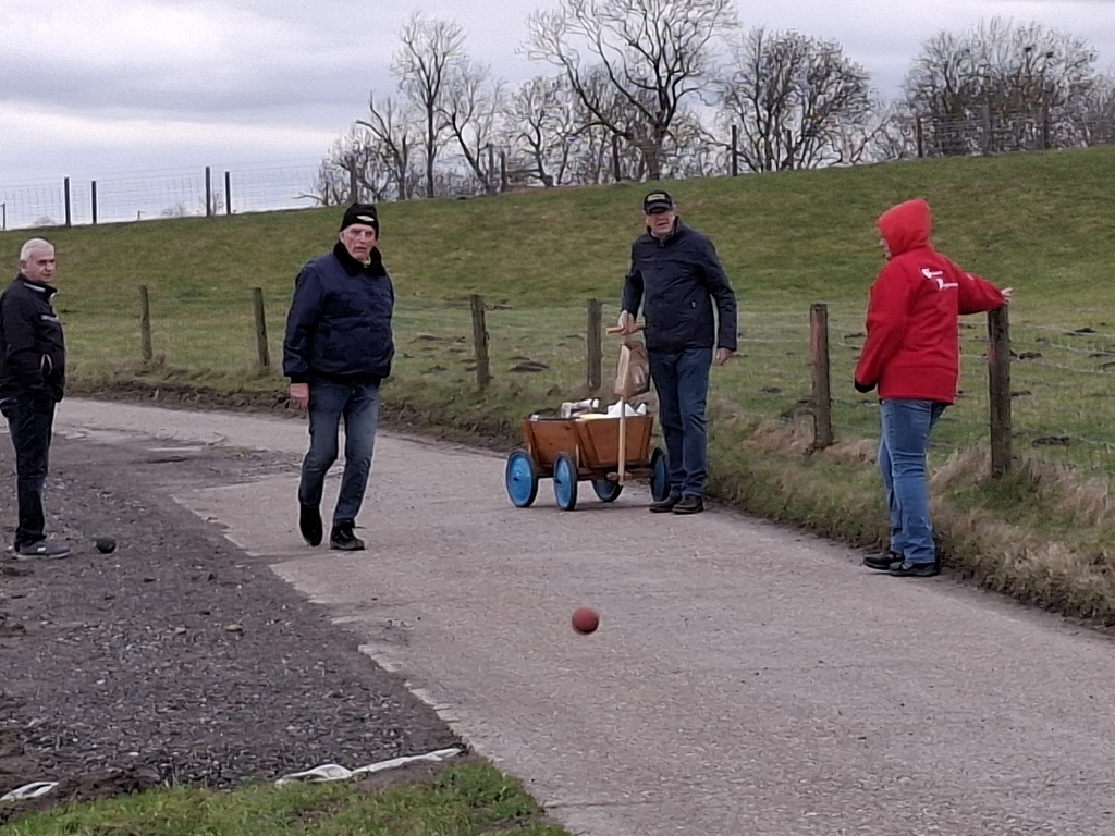 Anschließend machten sich die spielwütigen Teilnehmer auf den Weg und boßelten am Deich um die Wette. Nach dem Hinweg bis zur Deichauffahrt war unser Bürgerverein mit einem Schött in Führung.