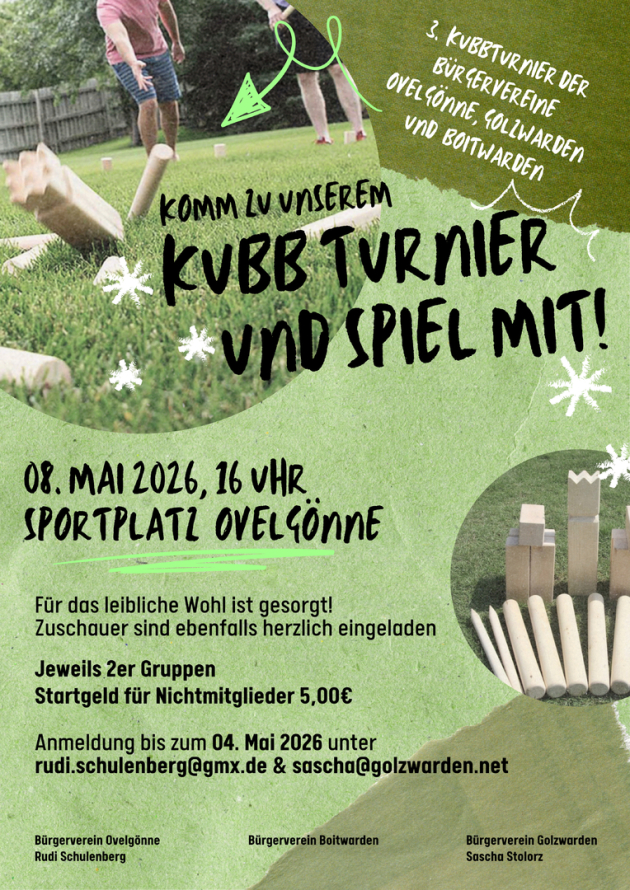 Darüber hinaus kann man sich für das 2. Quartal schon mal merken, dass es am 8. Mai in Ovelgönne die 3. Auflage des Kubb-Turnier geben wird und der Bürgerverein bei den Containern jeweils am 15., 22. und 29. April ein „freies Training“ – auch zum kennen lernen des Spiels – anbieten wird. Für das Pfingstbaumsetzen am 23. Mai sind auch das Binden des Pfingstbaums am 21. Mai bei der Feuerwehr sowie die Abnahme des Pfingstbaumes am 08. Juni Termine für die Gemeinschaft. Am 13. Juni findet die alljährliche Fahrrad-Tour statt.