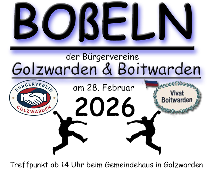 Das alljährliche Boßeln der Bürgervereine aus Boitwarden und Golzwarden – immer am 4. Samstag im Februar – findet dieses Mal in Golzwarden statt. Auch, wenn man noch nie geboßelt hat – kein Problem: der Spaß und die Geselligkeit steht im Vordergrund.
