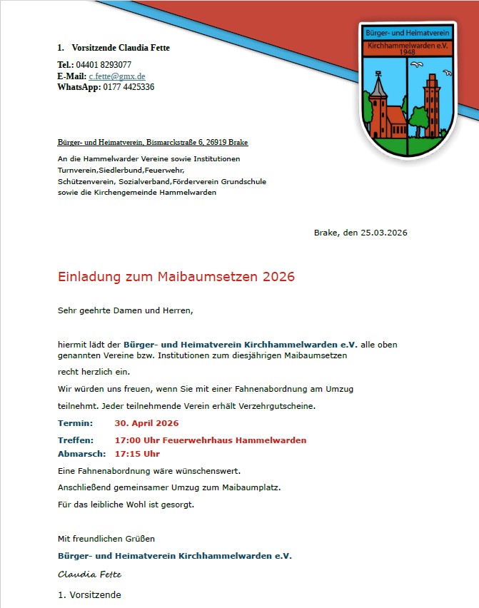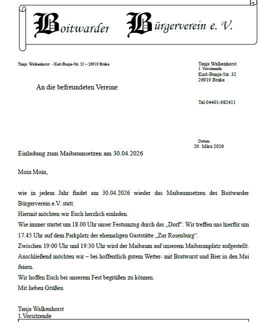 Ein Paar Termine für 2026 Schon mal vor ab ein paar Termine: 10. Januar wird ab 9 Uhr der Adventskranz wieder abgebaut 19. Februar, 19:30 Uhr Jahreshauptversammlung im Gemeindehaus 28. Februar, 14 Uhr Boßeln gegen den Boitwarder Bürgerverein 13. Juni: Fahrrad-Tour 08. Mai: Kubb-Turnier in Ovelgönne 15., 22. & 29. April wird bei den Containern trainiert Weitere Termin folgen mit der Einladung zur Jahreshauptversammlung….