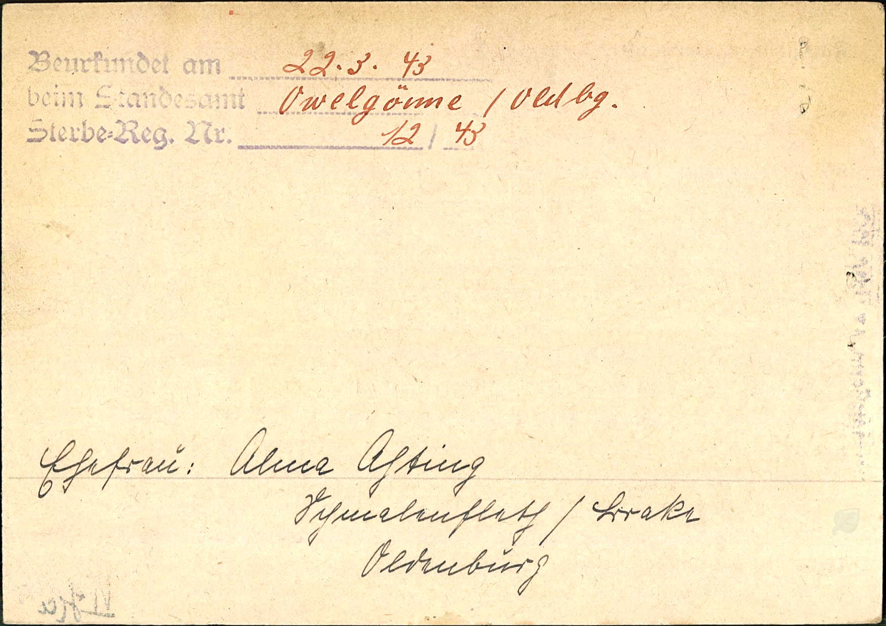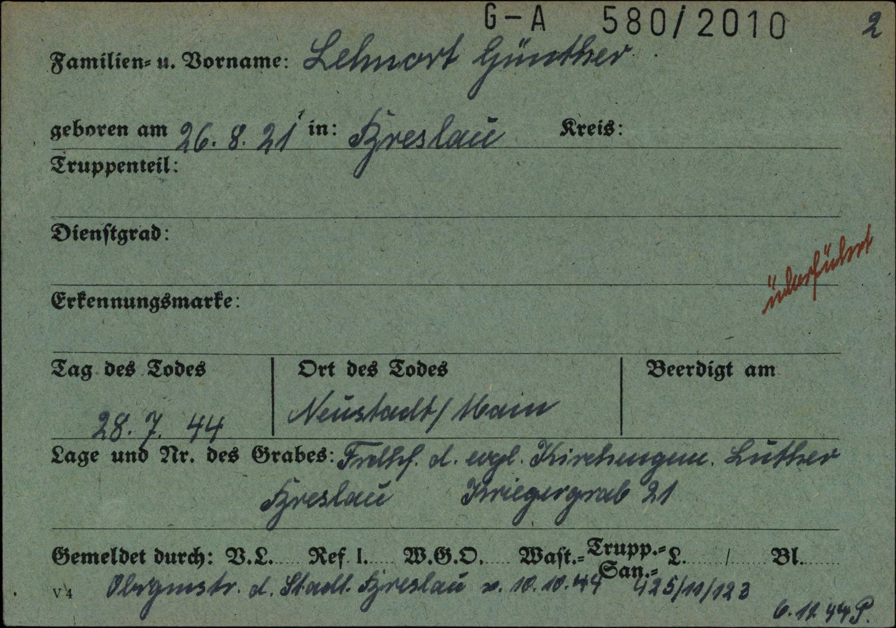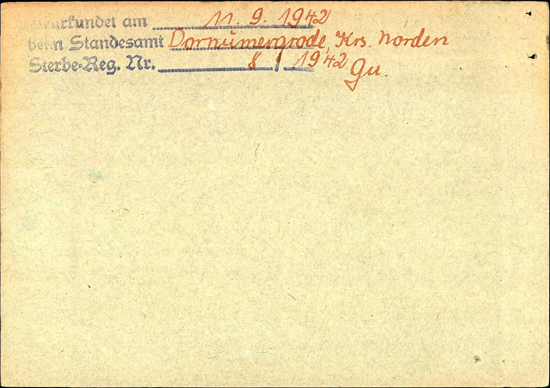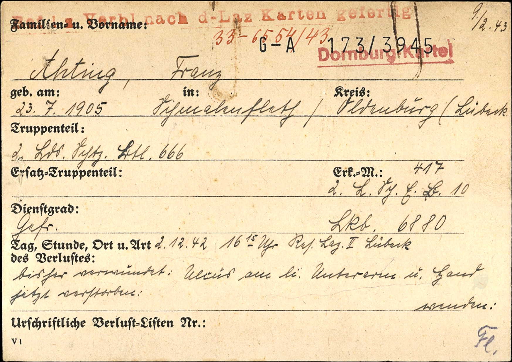 Verstorben am 02. Dezember 1942 um 16:15 Uhr nach einer Verwundung im Lazarett in Lübeck |