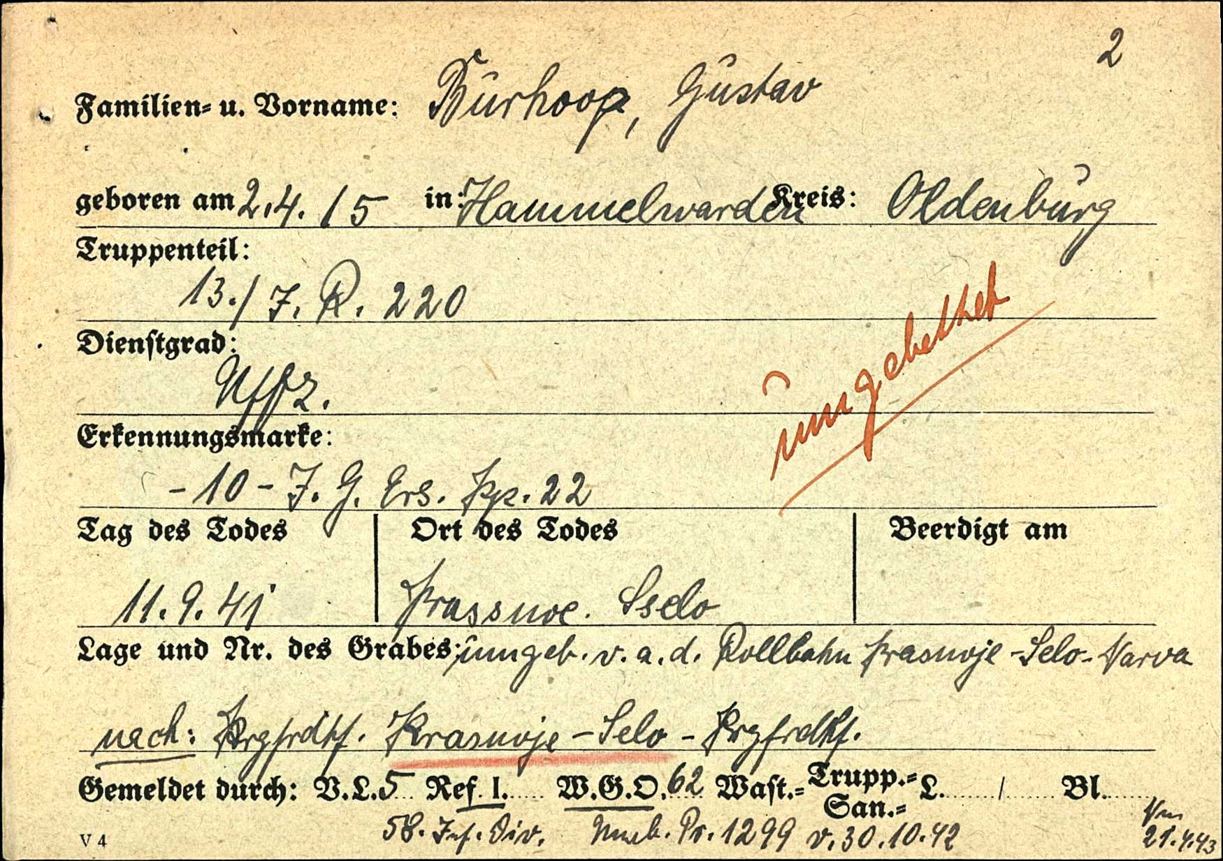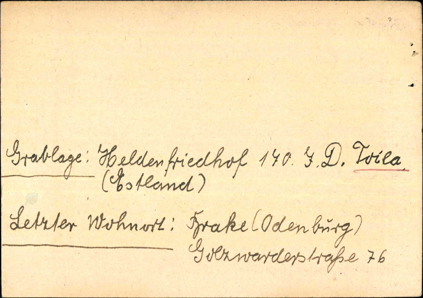 War auf dem Heldenfriedhof Toila 170 (Estland) begraben. Vermutlich umgebettet in Toila