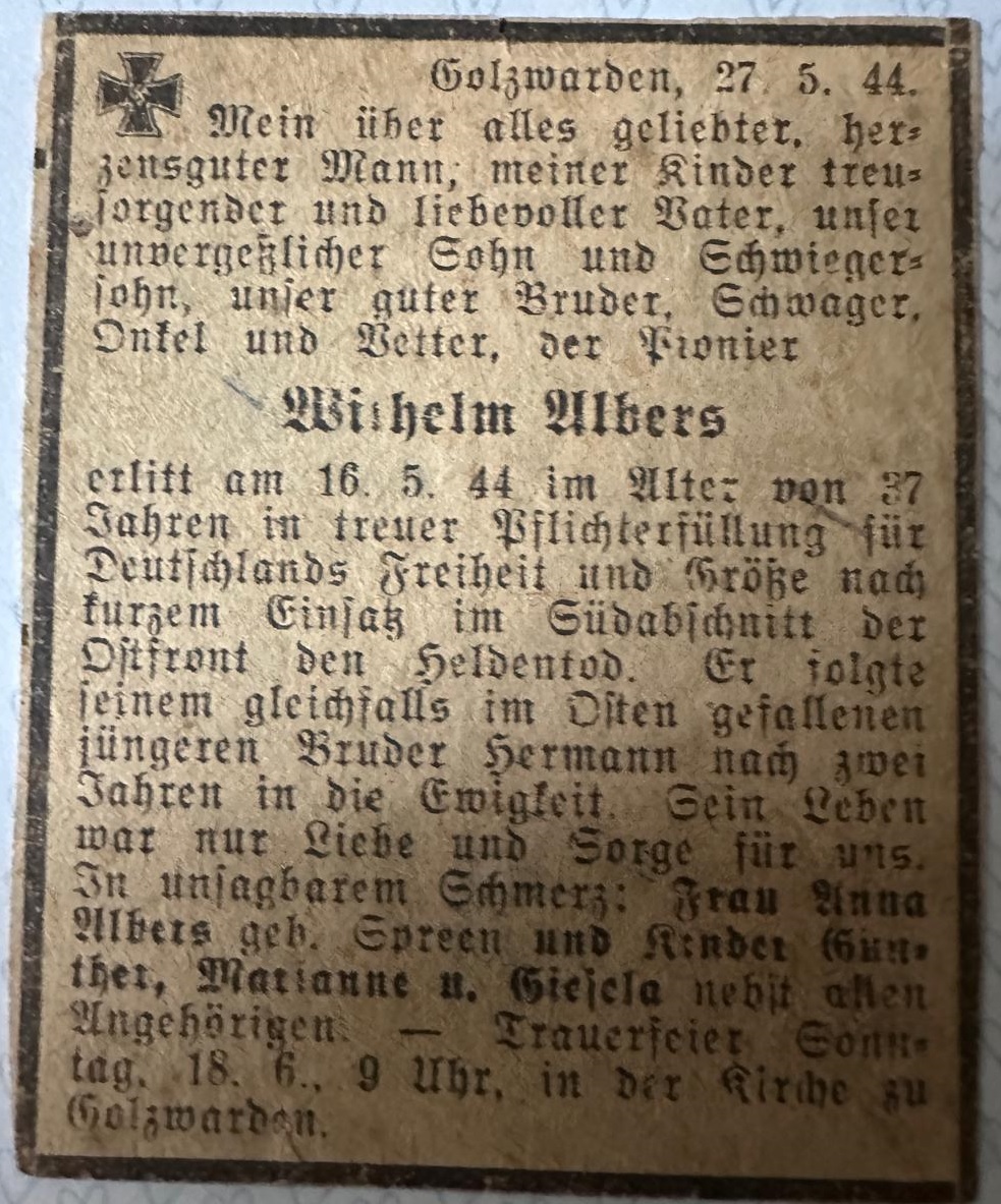 Gefallen mit 37 Jahren am 16. Mai 1944 im Südabschnitt der Ostfront |